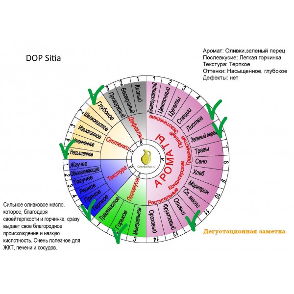 Обозначение на этикетке P.D.O. Sitia, Crete (P.D.O. – знак защищенного наименования места происхождения) означает, что это масло произведено в регионе Сития острова Крит. Сития - один из самых известных в мире регионов, производящих оливковое масло высшего качества. Эксперты объясняют этот факт исключительным географическим положением региона, особенностями местного климата и почвы. Приведем лишь одну цифру - в регионе Сития насчитывается более 3000 солнечных часов в год!