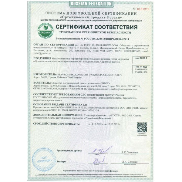 Органическое оливковое масло производится только из олив, культивируемых исключительно традиционными методами без применения химических веществ и удобрений. Его биокультивация подтверждена греческой организацией сертификации органической продукции (BIO HELLAS).