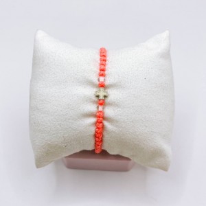 Розовый вязаный браслет с двумя прозрачными бусинами и белым металлическим крестиком, Афон.