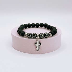 Православный браслет - чётки из гематита и вулканической лавы с металлическим крестиком-подвеской.