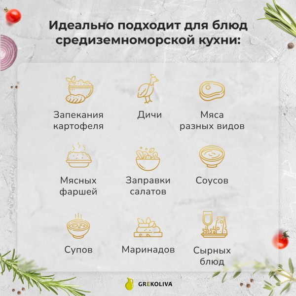 Рыба, картофель, баклажаны, кабачки и помидоры будут особенно вкусными и ароматными, если до запекания Вы добавите к ним 1-2 ложечки нашего оливкового масла с розмарином.