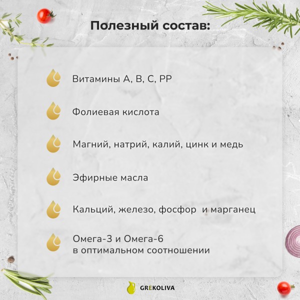 СВЕЖИЕ веточки розмарина настаиваются в оливковом масле первого холодного отжима (extra virgin). Т.о. масло оливковое Ecogreece приобретает невероятный камфорный аромат с хвойными нотками.