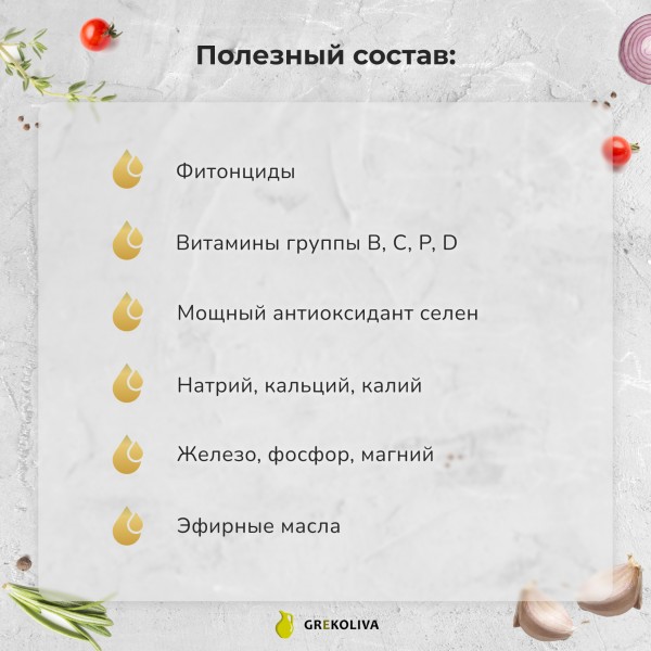 Другие производители добавляют в оливковое масло экстракт или эфирное масло чеснока, т.к. работать со свежим "живым" чесноком очень сложно. Но нам это удалось!