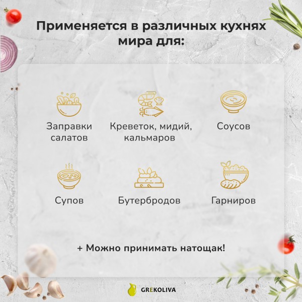 Блюда какой бы кухни вы не планировали приготовить, оливковое масло с чесноком Ecogreece вам пригодится. Ведь всего одна ложка этого масла придаст такой любимый с детства вкус супам, салатам, соусам, бутербродам.