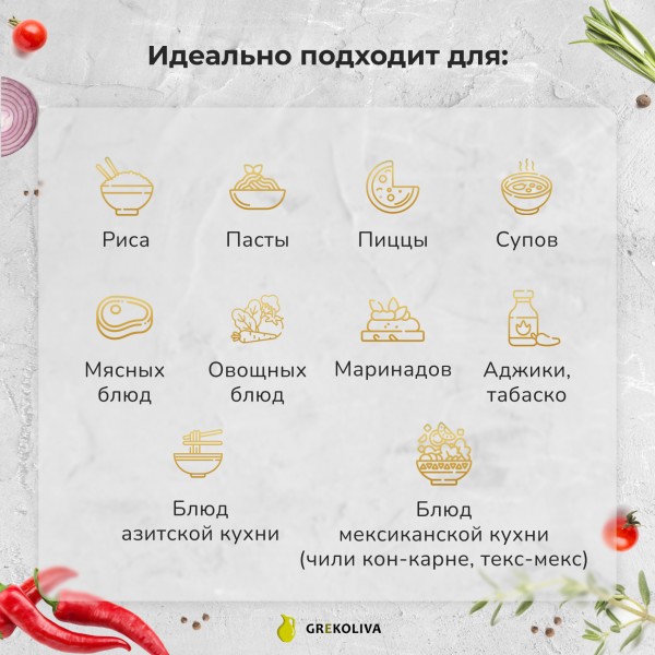 Оливковое масло и чили – классическое сочетание для придания остроты и особого аромата блюдам из овощей, бобовых, салатам, соусам, мясу и рыбе.