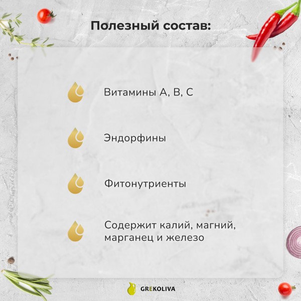 Состав: оливковое масло нерафинированное (Extra Virgin), перец чили.