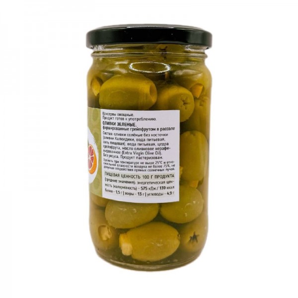 Оливки зеленые, фаршированные грейпфрутом, в рассоле.
