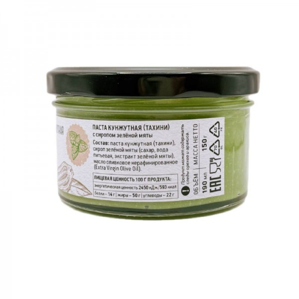 Паста кунжутная (тахини), сироп зеленой мяты, масло оливковое нерафинированное (Extra Virgin Olive Oil).