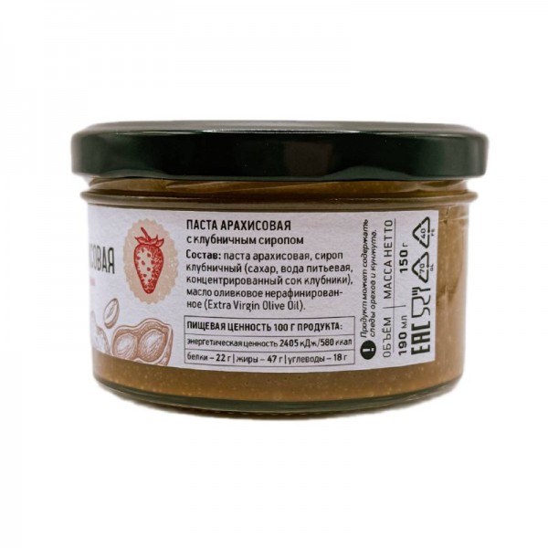 Паста арахисовая, сироп клубничный (сахар, вода питьевая, концентрированный сок клубники), масло оливковое нерафинированное (Extra Virgin Olive oil).